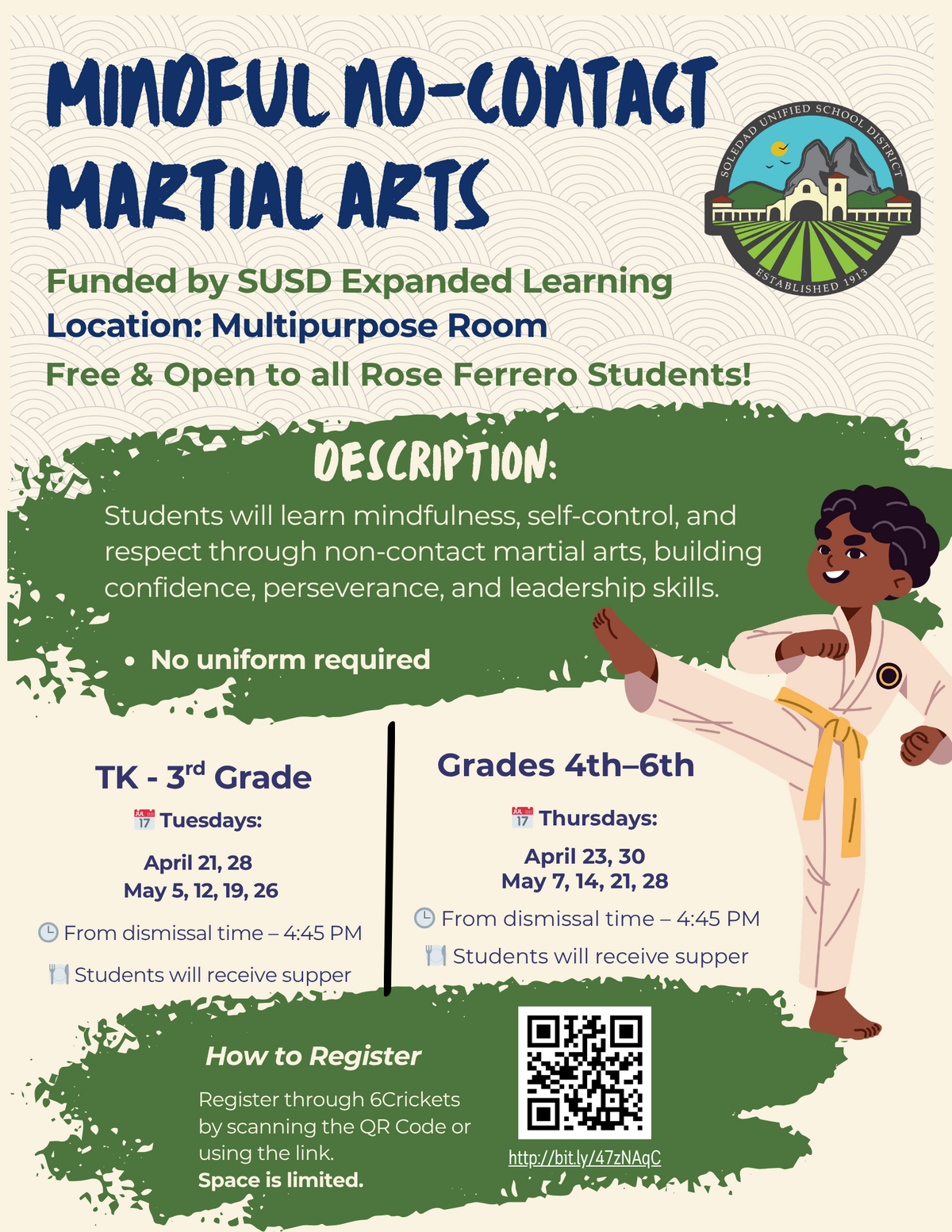 We are excited to share that Mindful No-Contact Martial Arts is coming to Rose Ferrero through SUSD Expanded Learning! This program is free and open to all Rose Ferrero students. 💚Students will lea...